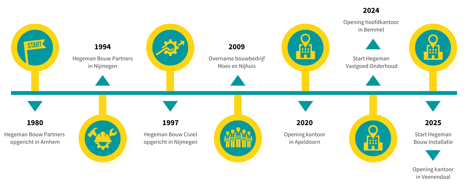 Wat ooit begon met een klein team en een groot geloof in goed bouwen, groeide stap voor stap uit tot het Hegeman dat we vandaag zijn. Vanuit Arnhem zetten we de eerste stenen — letterlijk én figuurlijk — voor een bedrijf dat draait op vakmanschap, vertrouwen en samenwerking. In de jaren die volgden breidden we uit, voegden we nieuwe specialismen toe en verwelkomden we nieuwe collega’s, partners en klanten.